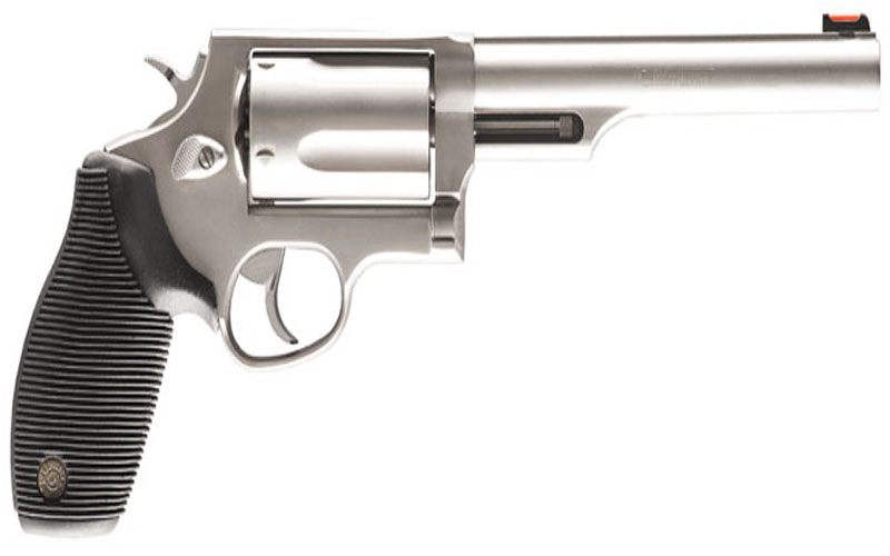 The “Taurus Judge® ” is so named because of the number of judges who carry it into the courtroom for their protection. Capable of chambering both .410 2-1/2″ shotshell and .45 Colt Ammunition, this amazing combo gun is ideal for short distances – where most altercations occur, or longer distances with the .45 Colt ammo. We have finely tuned the rifling to spread the shot pattern at close quarters or to guide the .45 cal. bullet to the target. Fully customized with fixed rear sights, fiber optic front sights and Taurus Ribber Grips®, the “Taurus Judge” is one decision-maker that lays down the law.